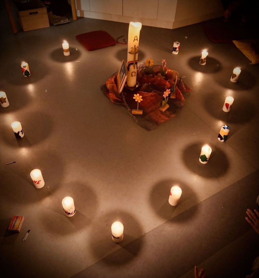Zurück im Haus am Oderplatz bekam jedes Kind eine Kerze und durfte sie mit Wachsplättchen verzieren. Sehr schön anzusehen wurden die kleinen Kunstwerke aufgestellt und angezündet. Ein